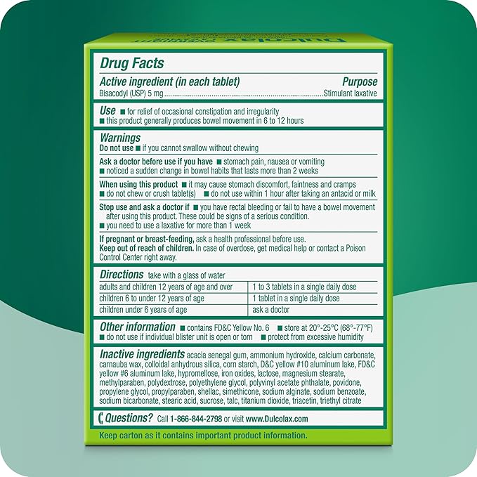 - Includes: One (1) 50-count box of Dulcolax stimulant laxative comfort-coated tablets