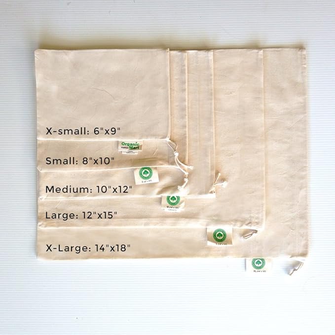 - COTTON CLOTH PRODUCE BAGS WITH TARE WEIGHT ON LABEL: Our reusable cotton cloth produce bags are made from the finest organic cotton without the use of any harmful synthetic pesticides, or fertilizers. This set includes 2 each of Small (8"x10"), Medium (10"x12"), Large (12"x15"). These cloth vegetable and produce bags have a tare weight on the label. The packaging is 100% recycled paper envelope which makes these bags zero waste bags.