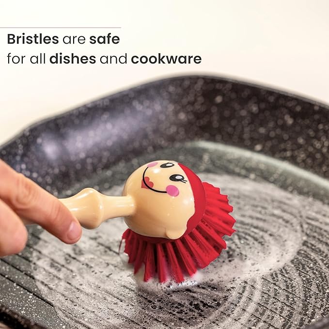 - PLAYFUL & PRACTICAL: Powerful nylon bristles tackle tough grease and stubborn, baked-on food without scratching non-stick surfaces.