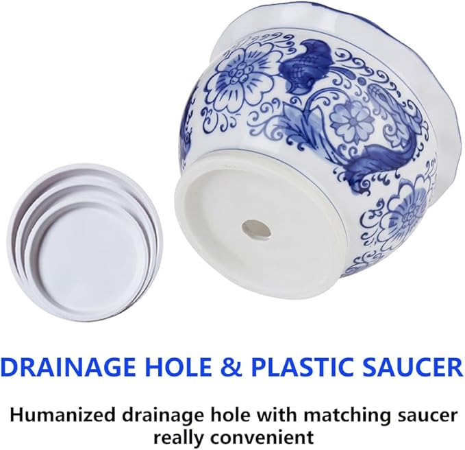 - Chinoiserie Design: Blue and white planter made of superior high temp fired ceramic, burnt finish adds blue and white color appearance. The plant pots looks great in apartments on windowsills, tabletops, bookshelves, coffee tables, offices, bedrooms, kitchens, gardens, patios and home decor