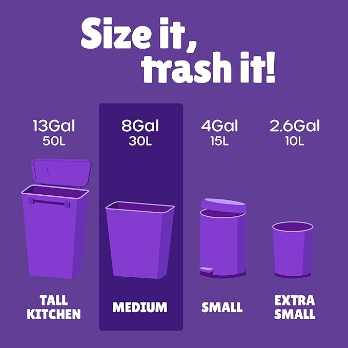 - Dimensions - 21 inches * 25.2 inches. 150 count of 8 gallon trash bags. Thickness: 0.48mil. Fit most of medium size trash bins. Our trash bags are all no smell, good for health.