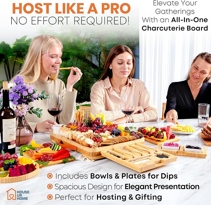 - Effortless Hosting Made Easy – Enjoy holiday entertaining with this bamboo charcuterie board, complete with ceramic bowls, plates, cheese knives, and serving forks to create stunning spreads of meats, cheeses, crackers, nuts, and fruits.