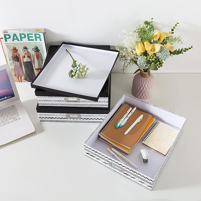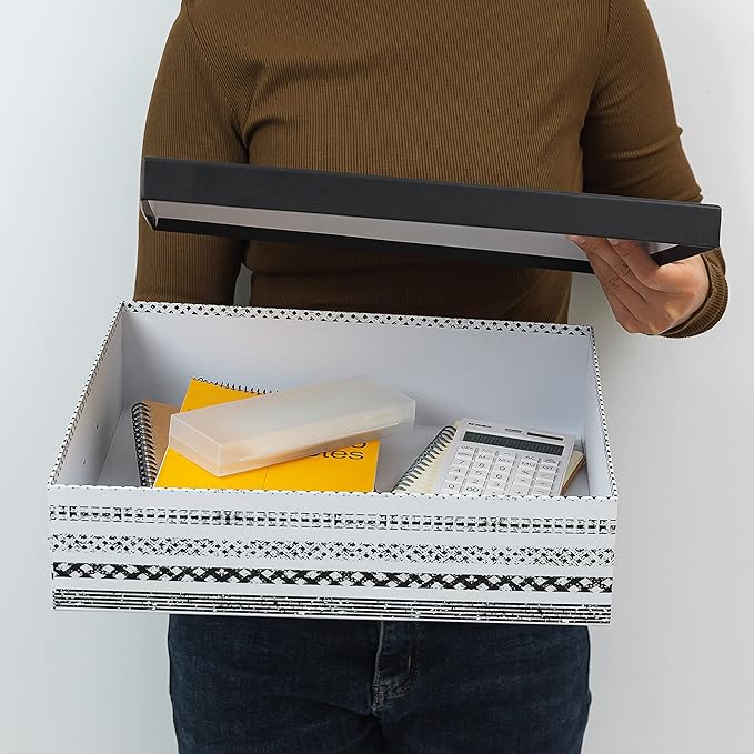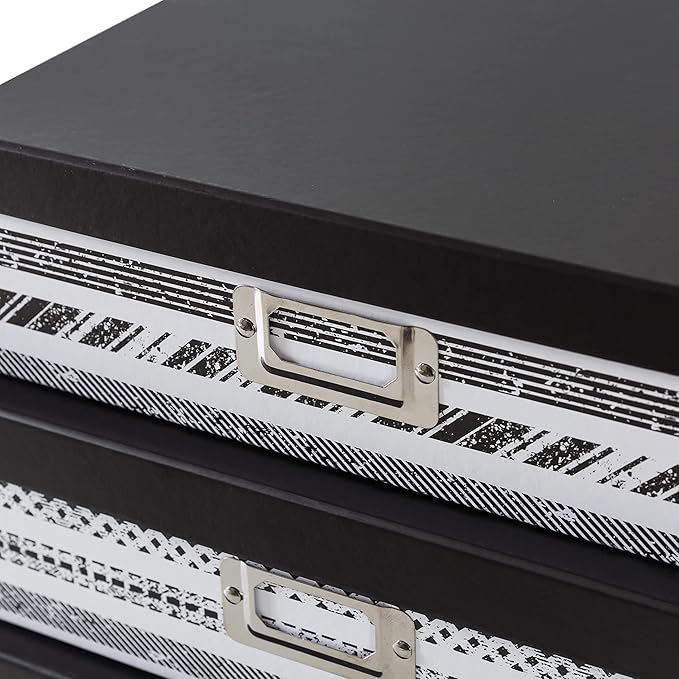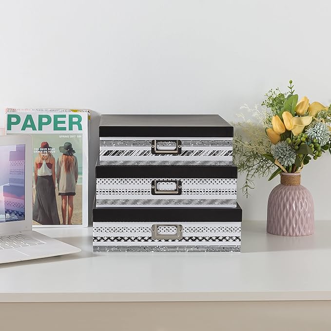 - Our set of 3 decorative cardboard storage boxes is an excellent way to organize and beautify your home. Each box is designed with a unique black and white stripe pattern that adds a touch of elegance to your decor. With these boxes, you can easily store your photos, documents, and scrapbooks while keeping them organized and protected from dust and moisture.