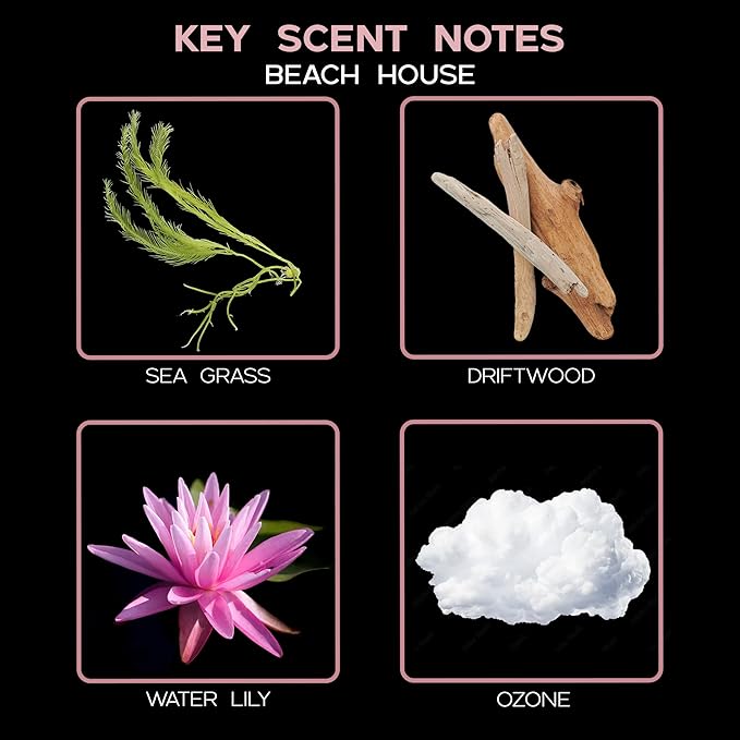 - BEACH HOUSE – smells like a breezy coastal escape with Sea Grass, Sand, Summer Sky, and Ocean; showcased in our Infinity Diffuser, a contemporary flat round glass bottle with a slender neck that playfully echoes a lollipop shape, topped with a navy sheer ribbon accent for a refined, timeless look and finished with real seashells; perfect for deep blue, indigo, and coastal décor.