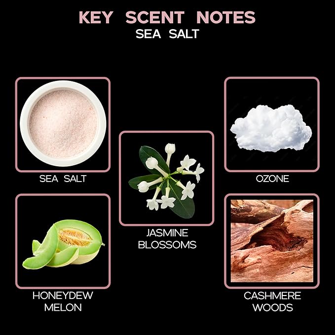 - SEA SALT – evokes the airy essence of Sea Air, Salt, Ozone, Jasmine Blossoms, and Musk; presented in our Modern Striped Diffuser, a sleek frosted glass bottle etched with clean vertical stripes for a minimalist yet eye-catching look, topped with a slender neck and delicate gray ribbon accent for a refined, timeless look; perfect for slate, charcoal, and coastal interiors