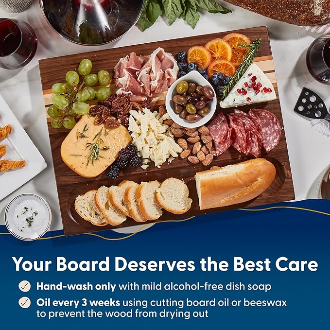 - KNIFE FRIENDLY WALNUT – Durable enough to sustain the blade of a knife but soft enough to avoid blunting it makes Walnut the top of the list for knife friendly wood, and an ideal cutting board material. As with all wood cutting boards, some knife marks will be present after use but regular oiling every 3 weeks will mellow the marks, brilliantly preserve the rich color, and prevent the board from drying out.