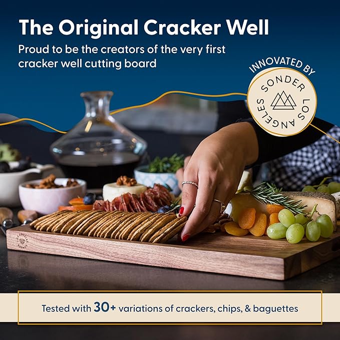 - READY TO PARTY – With intelligent design features created with you in mind, Motley is ready to shine at your next party. Easily assemble a charcuterie board with the help of our built-in signature Cracker Well which is perfectly sized to hold a variety of crackers, sliced baguette, or any small items that may roll such as nuts, olives, and berries. Party on the move? Use the built-in handles to take the board and its delicious contents with you.