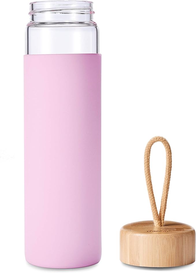 - RAW & NATURAL BAMBOO LID MEETS SCIENCE - Forget About Leaking Bottle Caps Ruining Your Furniture: Scared of your little fur buddies running around the house, flipping your travel water bottle, and creating a mess? Yomious reusable water bottle has a natural bamboo lid that is effectively wide mouth designed with a stainless steel insert and a commercial-grade Silicone O-Ring seal to give you spill-proof glass drinking bottles with lids.