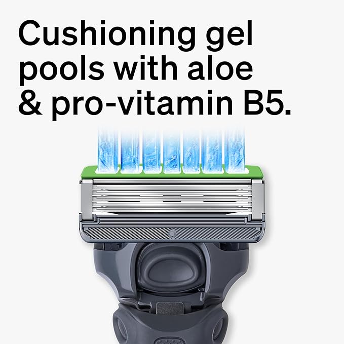- MAXIMUM COMFORT – Dermatologist-tested, our 5 blade razor refill has 7 Cushioning Gel Pools, enriched with Aloe and Pro-Vitamin B5, that hydrate and soothe skin for maximum comfort while you shave.