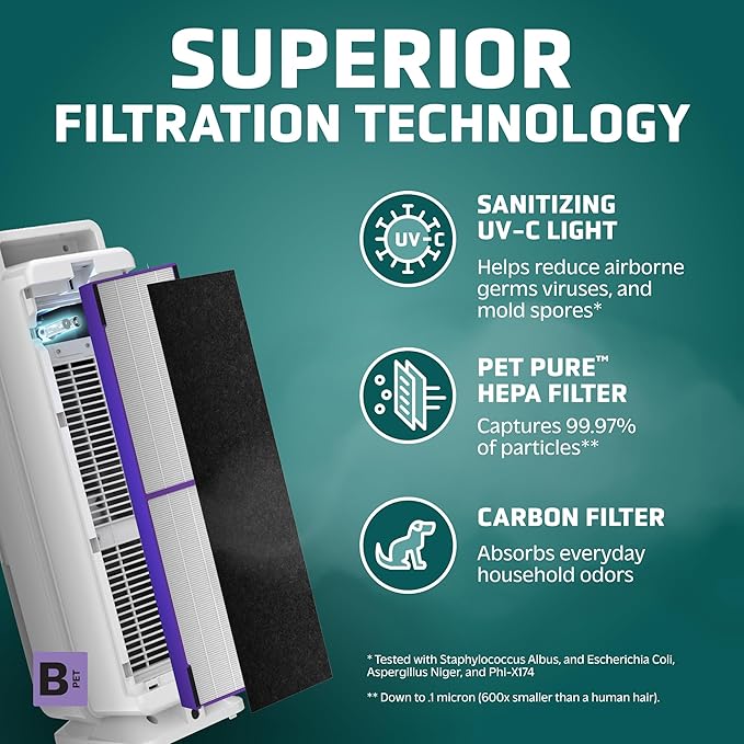- GENUINE HEPA PET PURE FILTER: Our Pet Pure HEPA Filter is designed to tackle pet dander, hair, and odors with exceptional efficiency, capturing up to 99.97% of harmful germs, dust, pollen, mold spores, and other allergens as small as .1 micron.