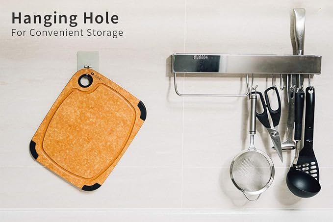 - π Unique Design - The wood fiber cutting board is equipped with a juice groove on one side to prevent liquids from spilling onto the counter. Easy-grip hole for convenient storage. Non-slip silicone corners/feet grip countertop surface, prevent the board from shifting during use, you can be confident the chopping board will stay firmly in place, more spare time could be concentrated on the kitchen.