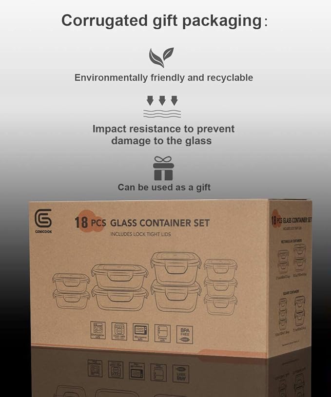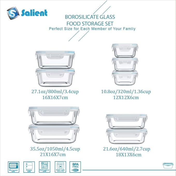 - 18 PIECES glass food storage container set- 9 glass containers and 9 matching Locking lids. Rectangle L(35.5OZ)*2 + M(21.6OZ)*2,Square L(27OZ)*2 + S(10.8OZ)*3. This glass bento box was designed with nesting, so the smaller containers fit inside the larger containers for ease of storage(S can be put in M size, M can be put in L size), save your space.