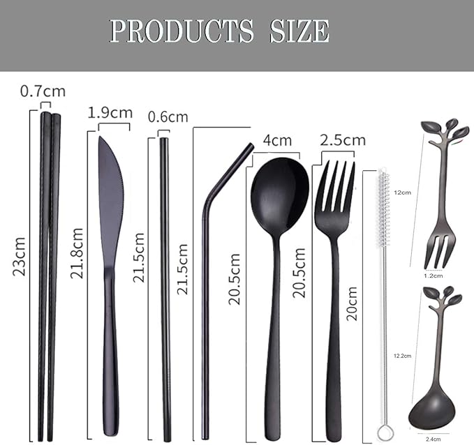 - ✿ The 9-Piece Travel Utensils Set: Comes with 1 Dinner Fork, 1 Tablespoon, 1 Knife, 1 Pair Chopsticks, 1 Cleaning Brush, 1 Straight Straw, 1 Bent Straw, 1 Dissert Spoon, 1 Dissert Fork,1 Carrying Case and 1 Carrying Pouch. Great for get-togethers, office lunches, formal or informal meals; Our travel cutley set with stylish and modern outlook pairs well with your dinner and serves a wonderful meal to friends in steak, wedding, birthday, and camping time.
