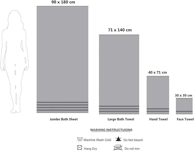 - INGREDIENT: Set contains 2 pieces of washcloths measuring 13 x 13 inches, 2 pieces of hand towels measuring 16 x 28 inches and 2 pieces of bath towels measuring 27 x 55 inches.