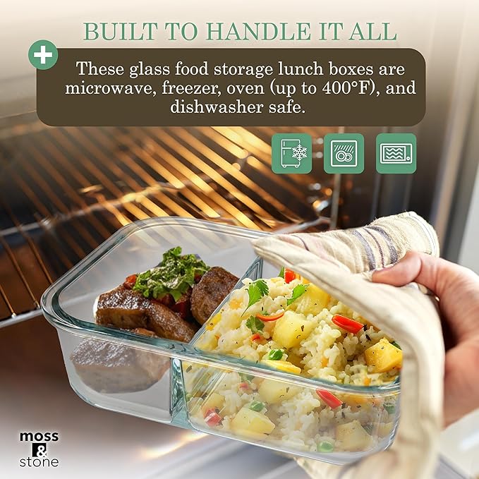 - Multi-Use & Heat-Safe: Glass food storage lunch boxes are microwave, freezer, oven (up to 400°F), and dishwasher safe. Remove lids before heating. Ideal for office, gym, travel meals, and picnics