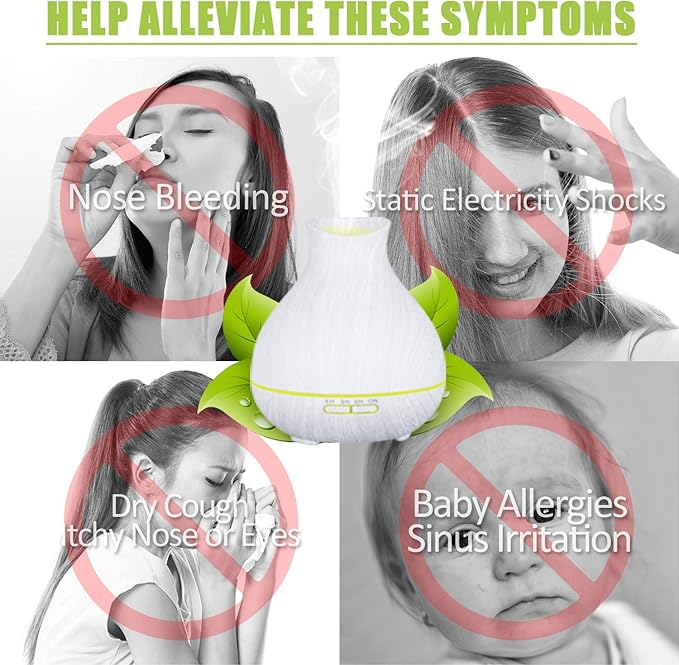 - REDUCE ALLERGIES SYMPTOMS IN DRY ENVIRONMENT: It helps improve your breathing and sleep if you spend long hours in an air-conditioned room and feel dry skin and thirst. This aromatherapy diffuser could provide a large amount of fresh air for those who suffer from Dry Cough, Itchy Nose or Eyes, Allergies Sinus Headaches, Sleeping Problems, or Dry Skin. A great housewarming or hostess gift idea for your parents, friends, and business partners.