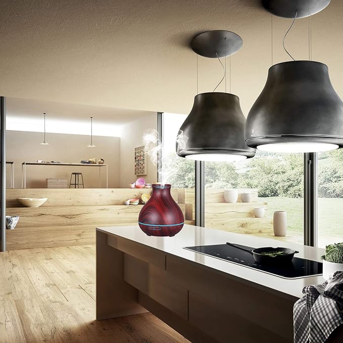 - ELEGANT LOOKING & LARGE CAPACITY -- The aromatherapy essential oil diffuser is made of plastic with a faux wood look and modern design, it blends naturally with most home decor. The changeable colored lights bring an elegant view, create a relaxing atmosphere to the room, and make your life more colorful. The large 550ml capacity is ideal for large rooms and covers an area of up to 480 ft².