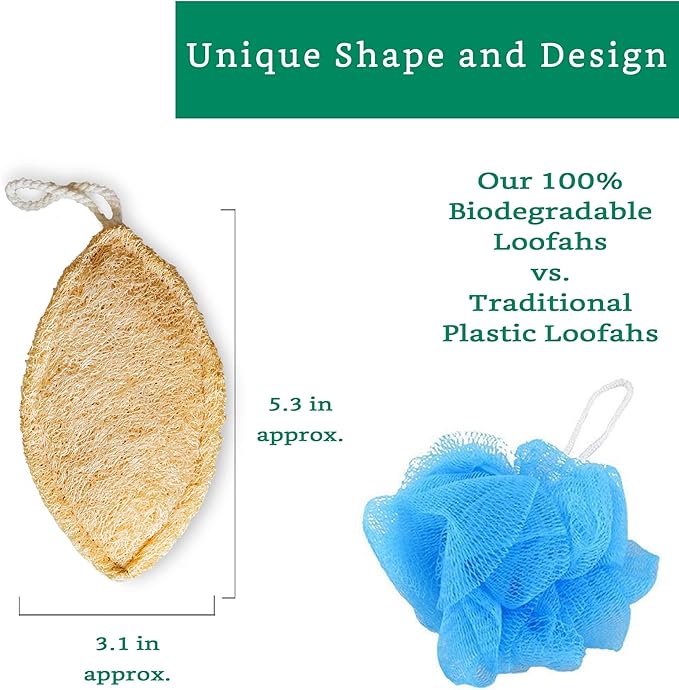 - 100% Plastic-Free: Our bath loofah sponges for shower are crafted from 100% biodegradable materials, providing a sustainable alternative to plastics, silicone, synthetic sponges and plastic mesh poufs. Our shower loofa can be composted into fertilizer, minimizing environmental impact. Packaged in brown paper to enhance our eco-friendliness and reduce plastic consumption.