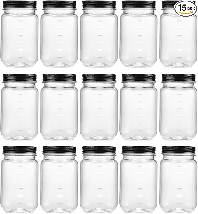 - Noveinks 16 oz CLEAR PLASTIC JAR : The package includes 15 pack 16 oz clear plastic jars with metal lids; Plastic Jar Product measures 2.8 Inches Diameter, 5.3 Inches Height.