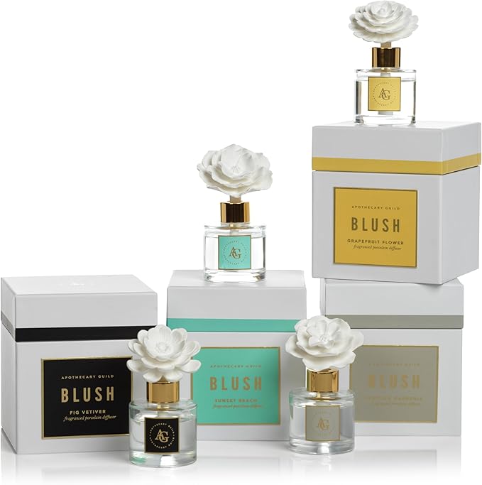 - INFUSE YOUR SPACE WITH LUXURY FRAGRANCE: Refresh your home decor with the Apothecary Guild Blush Porcelain Oil Diffuser. Our diffuser set includes fragrant oil, a beautiful porcelain flower, a metal collar cap, a silicon stopper, and a clear plastic funnel.