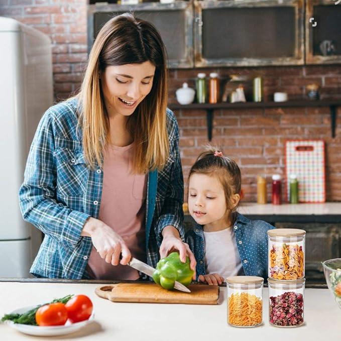 - 【High Quality Materials】The airtight glass jar set is made of food-grade high borosilicate glass, 100% lead-free.These cute glass containers are thicker than other jars.There is a silicone ring on the bamboo lid that will not make a sound and scratch the jar when the lid is opened.This glass storage tank can be heated to 150 degrees Celsius with an open flame or frozen to minus 20 degrees Celsius.