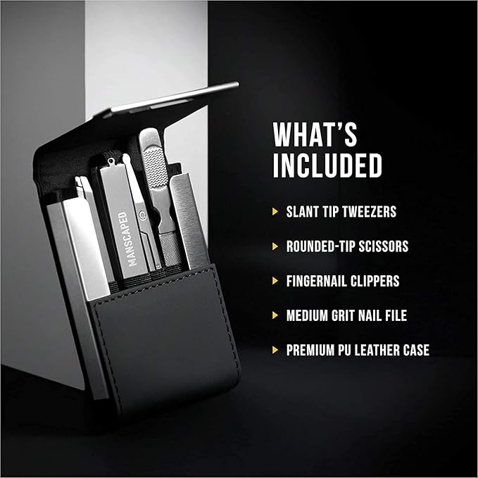 - WHAT'S INCLUDED: Slant-tipped tweezers, rounded point scissors, fingernail clippers, medium grit nail file, in a compact premium PU Leather case.