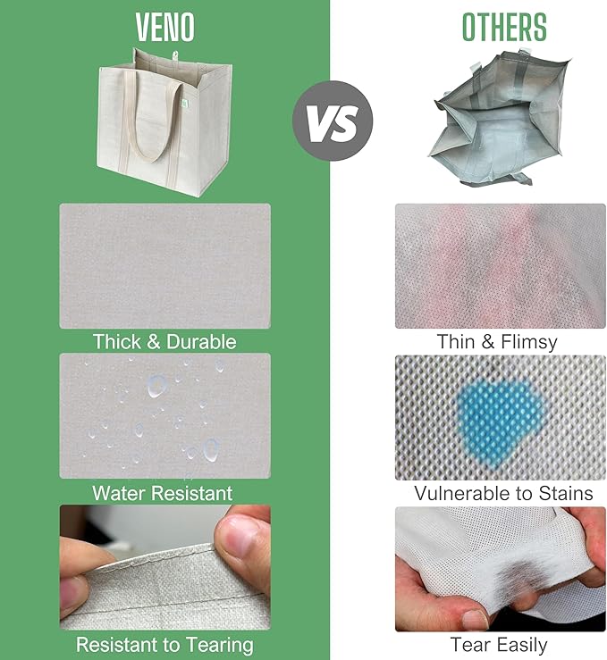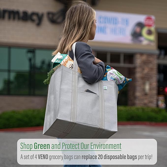 - Reusable & Sustainable to Protect the Environment – VENO reusable grocery shopping bags are created through maximizing the use of post-consumer material to make high-grade bags that save plastic from ending up in oceans, lakes, and landfills. Help us in protecting our environment to create a cleaner, more livable future. Collapsible and foldable for future use and easy storage in your car, glove compartment, kitchen, cabinet, drawer, luggage, or purse!