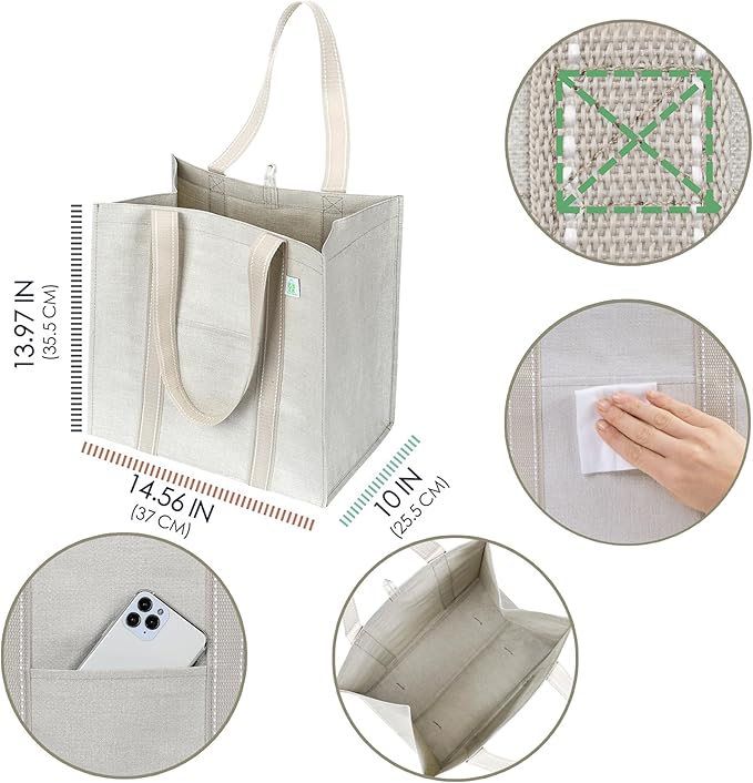 VENO 4 Pack Reusable Grocery Bags, Heavy-Duty Shopping Bags with Handles, Bags for Shopping Cart with Hard Bottom to Stand Upright, Foldable, Multi-Purpose, Sustainable (Beige, 4 Pack)