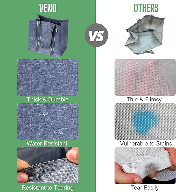- Reusable & Sustainable to Protect the Environment – VENO reusable grocery shopping bags are created through maximizing the use of post-consumer material to make high-grade bags that save plastic from ending up in oceans, lakes, and landfills. Help us in protecting our environment to create a cleaner, more livable future. Collapsible and foldable for future use and easy storage in your car, glove compartment, kitchen, cabinet, drawer, luggage, or purse!