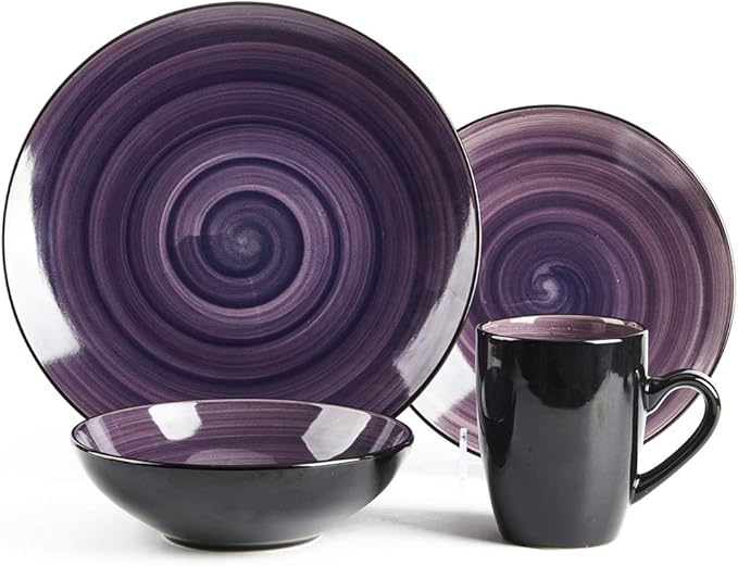 Sonoma 16 Piece Stoneware Dinner Set, Samoa, Outside Black + Inside Hand painted Combi Colors of Grey, Orange, Purple and Turquoise) with speckle