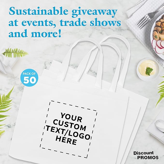 DISCOUNT PROMOS Custom Jumbo Sized Tote Bags Set of 50, Personalized Bulk Pack - Reusable Grocery Bags, Shopping Bags, Promotional Item Totes for Women - White