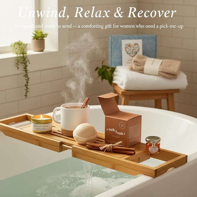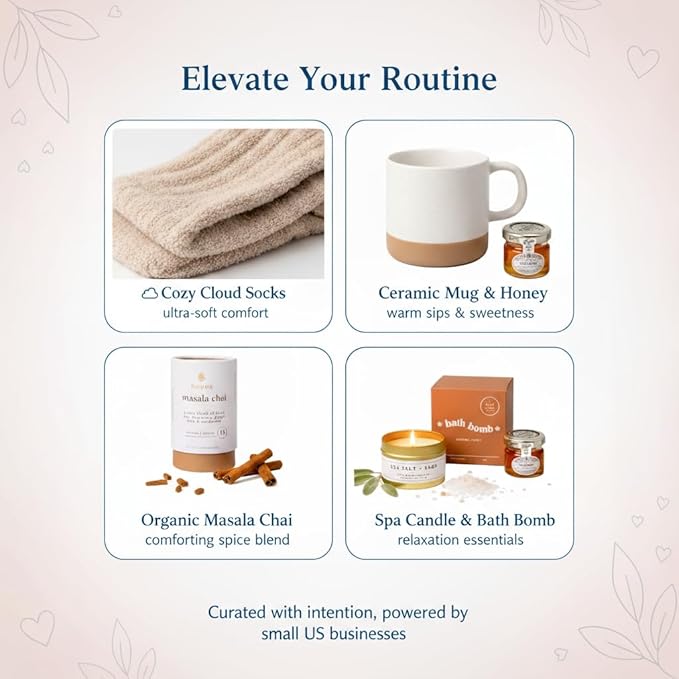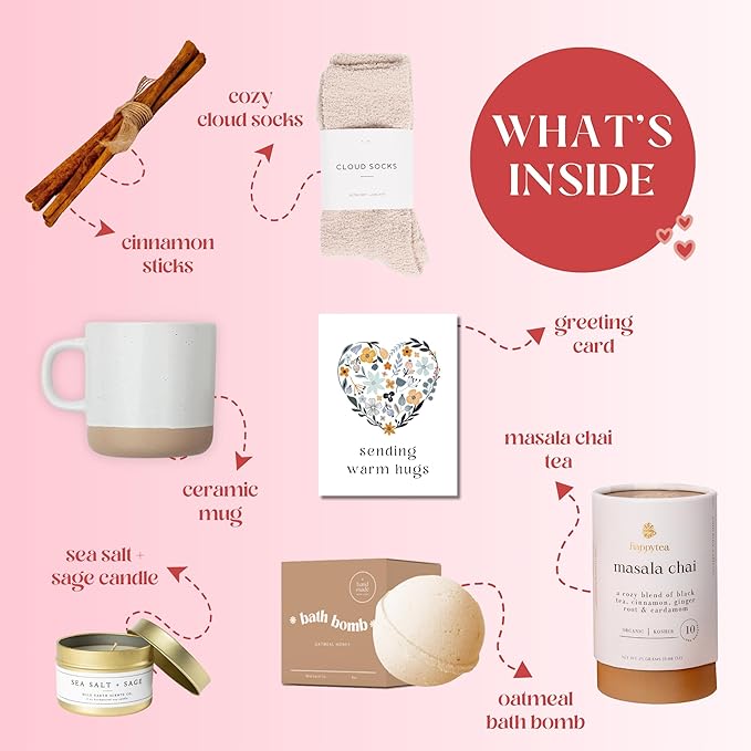 - The Perfect Gift - Elevate the healing experience with the Unboxme tea gift box, the perfect comfort gift for anyone in need of some love. This carefully curated wellness tea gift set includes fluffy socks, ceramic mug, chai tea, honey jar, bath bomb, candle, cinnamon sticks & a greeting card. It makes the perfect choice for a get well soon gift basket, a post surgery care package, or a heartfelt gesture to comfort someone dealing with illness or recovery.