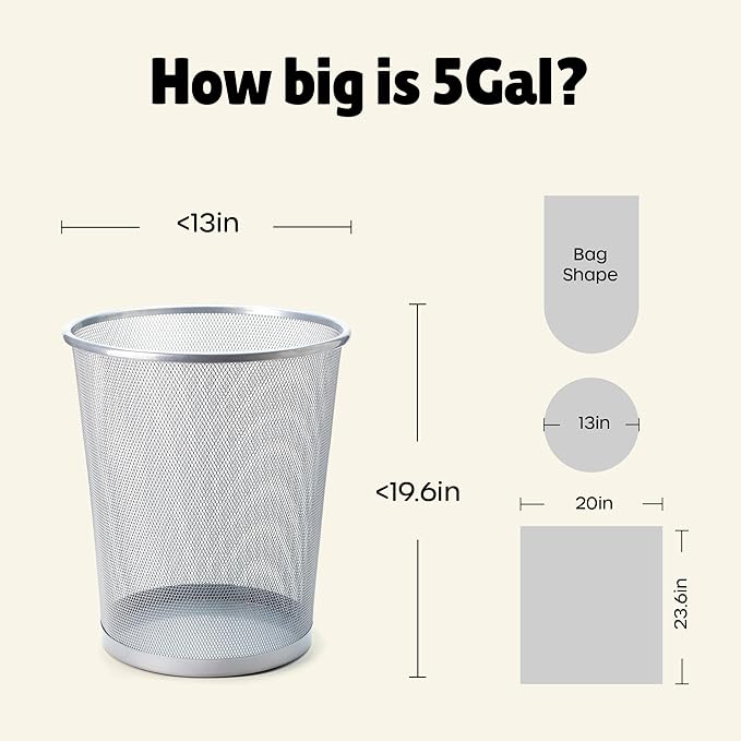 - Dimensions (L*W) - 20 inches * 23.6 inches. Thickness: 0.48mil. Fit small size trash bins, round garbage bins with diameter ≤ 13", height ≤ 19", rectangular wastebaskets. Perfect fit for any medium sized waste basket.