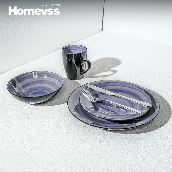 Sonoma Stoneware 16pc Dinnerware Set, Outside Black + Inside Hand Painting Color Cobalt
