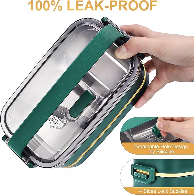 - 2.HIGH MATERIAL: The adult bento box large designed with two parts: high quality PP plastic and 304 stainless steel, durable, rust-proof and anti-corrosion. It creates a safe and healthy food storage container for you.dishwasher and freezer safty. 100% leak-proof, our lunch organizer containers with 4 sides lock buckles, whether you use stainless steel trays or plastic bottom trays, it can prevent any leaks, spills or smells in your bag, as well as keeping food fresh and tasty