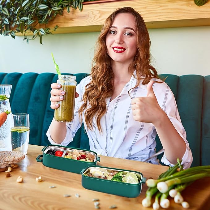 Stainless Steel Bento Box for Adults&Kids,Japanese Leakproof Lunch Box Divided Food Meal Storage Containers Set Stackable 2 Layer for Children School Picnic Green