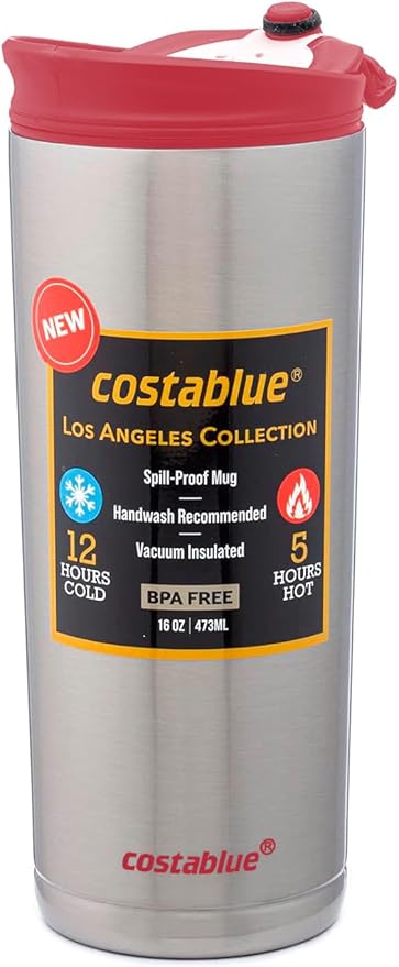 - INSULATED MUG: The Costablue insulated coffee tumbler is made with a double-wall vacuum insulated stainless steel to keep your beverages cool or warm for a long time. This coffee travel mug keeps your drinks hot for 3 hours and cold for 8 hours.