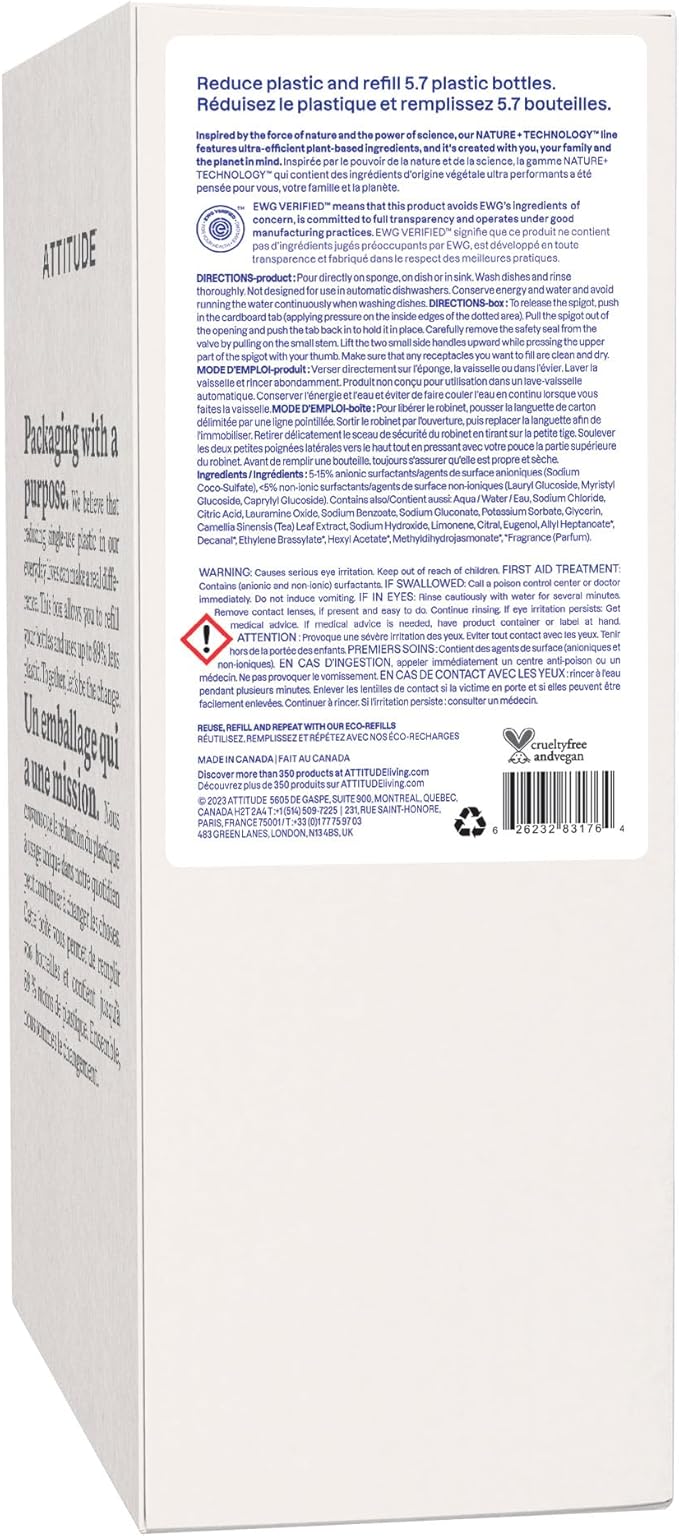 ATTITUDE Dish Soap Refill, EWG Verified, Plant-Based & Vegan Dishwashing Liquid, Naturally Derived, Pink Grapefruit, 135.3 Fl Oz