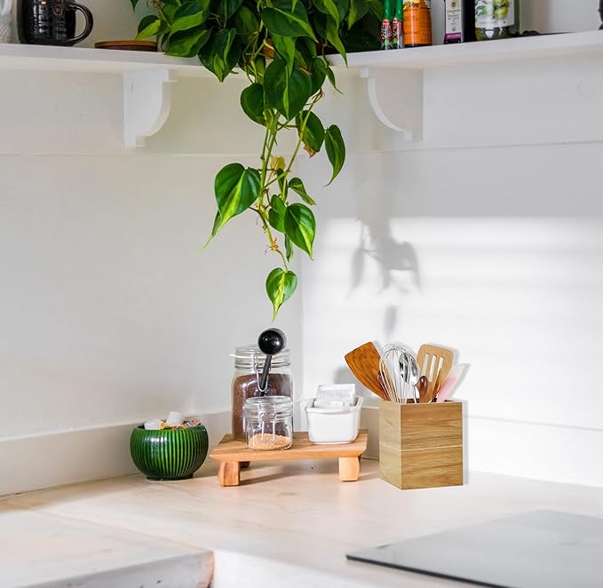 Spiretro Acacia Wood Kitchen Utensil Holder & Organizer – Countertop Cutlery Storage for Cooking Utensils, Spoons, Spatulas, Forks, Whisks & Knives – Lead-Free Lacquer, 5" W x 5" D x 6.5" H