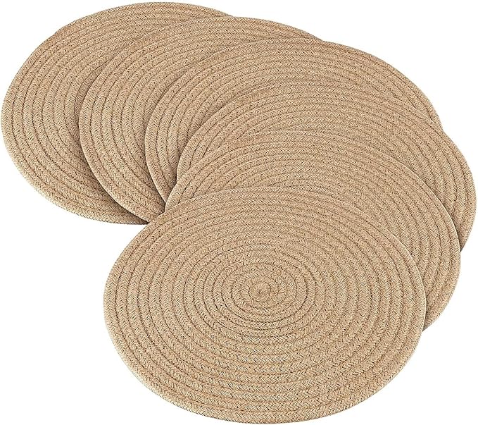- [Versatile Used]: This woven placemats set is the decorative piece for your dinners or wedding parties. Handcrafted, durable thick cotton braided mats keep tabletop safe from heat and water. Use under hot pots, hot pans, protect your counters and tables from heat. Use under plants to protect the wood floor they are on.