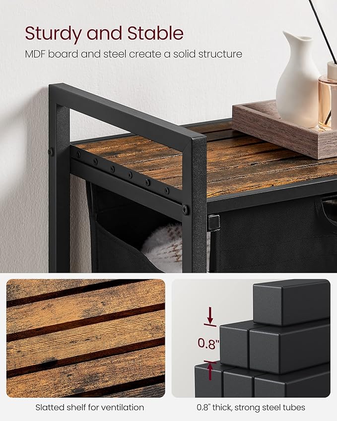 VASAGLE Laundry Hamper, Laundry Basket, Laundry Sorter with 2 Pull-Out and Removable Bags, Shelf, Metal Frame, 2 x 12.1 Gallons (46 L), 28.8 x 13 x 28.4 Inches, Ink Black and Rustic Brown UBLH201B01