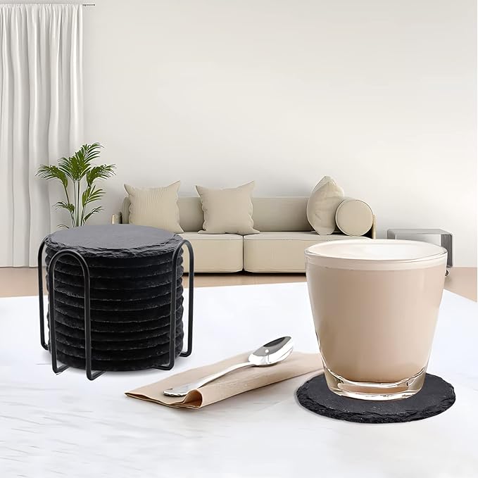 - PERFECT MATCH AND EASY CLEAN - Each round slate coasters for drinks measures 4 inches in diameter, making it just the right size for all standard cups, mugs, and glasses. Cleaning your new absorbent coasters is as simple as using them. Just rinse the coaster with water and wipe it with a cloth, but for heavy stains, you can soak and wipe them with detergent or baking soda.
