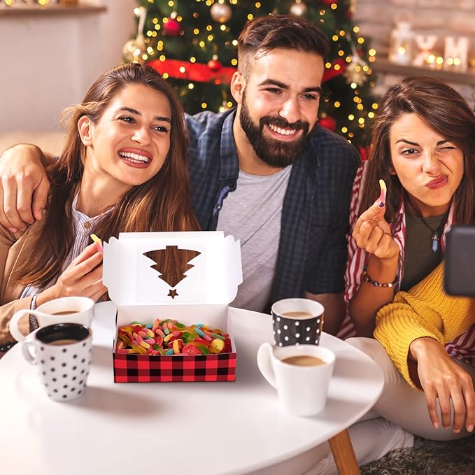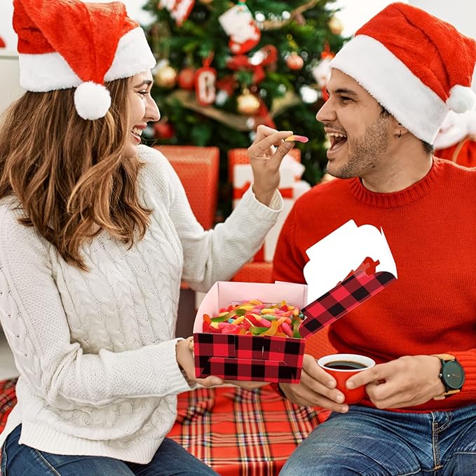 Ruisita 30 Pack Christmas Cupcake Boxes Plaid Cookie Gift Boxes Food Treats Container with Tags for Cupcake, Candy, Party Favors (Red+Black, 10 x 6.3 x 3 Inches)
