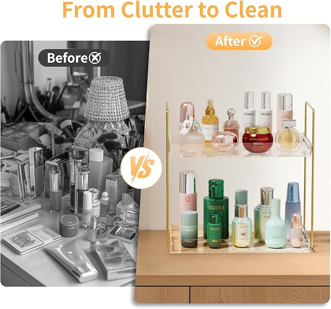 - [OPEN AND CLASSIFIED STORAGE] This bathroom countertop organizer shelf is open, 2-tier design, no need to pull closed, different types of items are classified and stored in different tiers, all items are clear at a glance, no more confusing items.