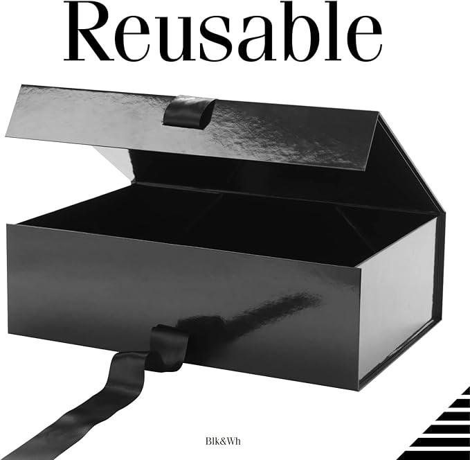 - BLK&WH large glossy black gift box with ribbon has a concealed and robust magnetic closure which allows the box to be opened and closed repeatedly without any problems. This luxury gift box can hold presents like hankies, souvenirs, cosmetics, gift cards, small candle, perfume and watches and more