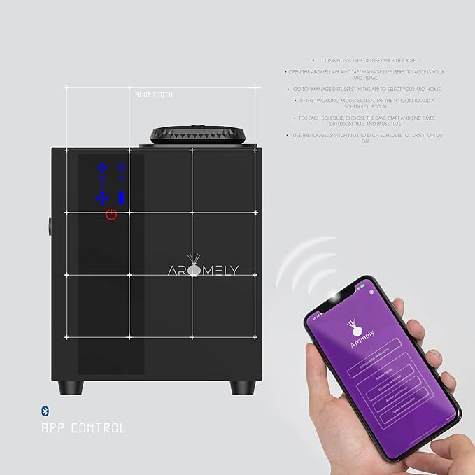 - Smart Control via Aromely Mobile App. Enjoy seamless control with the Aromely mobile app (iOS/Android). The app allows you to remotely adjust scent intensity, create customized schedules (24/7), and monitor usage from anywhere, ensuring a personalized aroma experience at your fingertips.