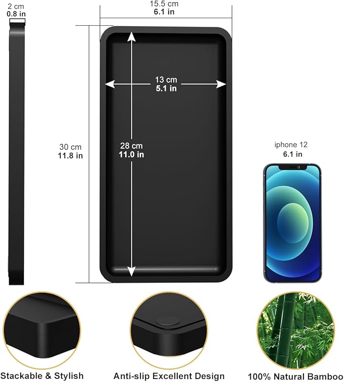 Bathroom Vanity Tray for Countertop - Bamboo Organizer Tray for Dresser Tops, Toilet, Perfume Small Decorative Wood Tray for Home Decoration 11.4” L x 6.1” W x 0.7” H (Black)