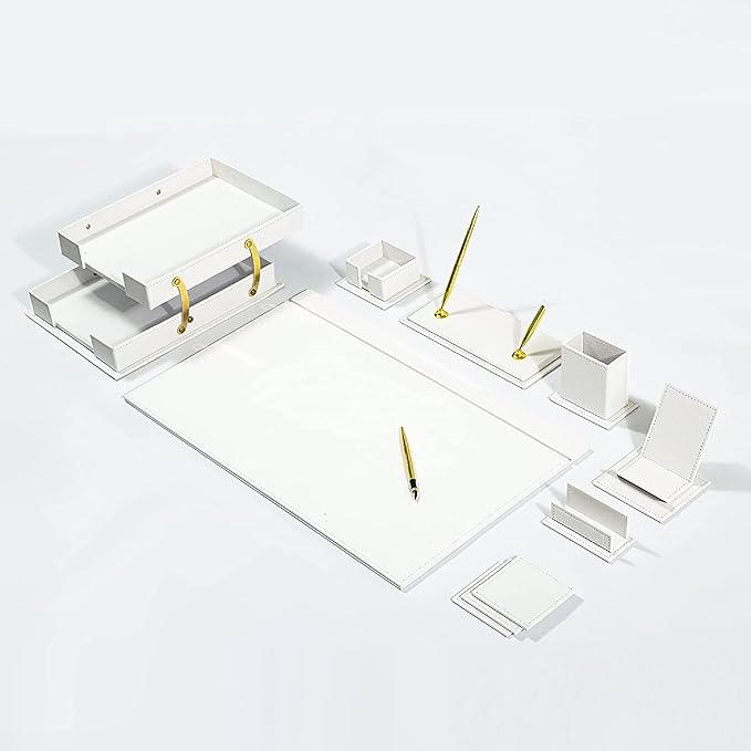 - We are offering you the opportunity to find the office accessories that you need, conceived by our finest leather artisans. Made with authentic leather and in a unique palette of colors, you will definitely add a distinct touch of class to your office décor. Our leather office sets are also well coveted among professionals who use them in conference or meeting rooms.
