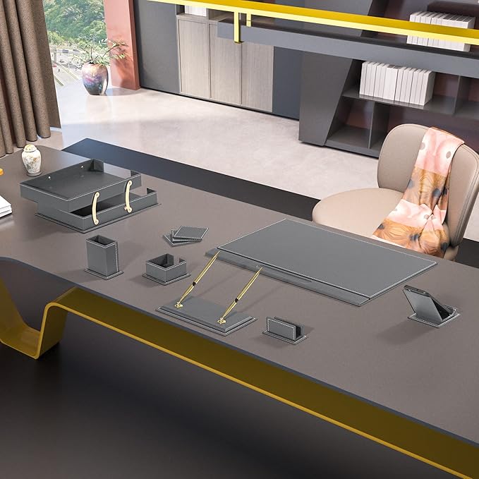 - We are offering you the opportunity to find the office accessories that you need, conceived by our finest leather artisans. Made with authentic leather and in a unique palette of colors, you will definitely add a distinct touch of class to your office décor. Our leather office sets are also well coveted among professionals who use them in conference or meeting rooms.