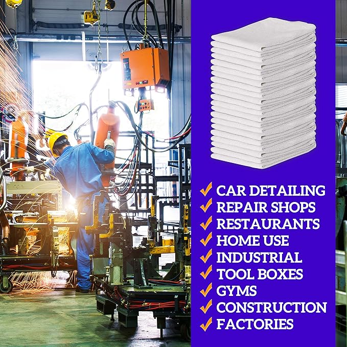 - Efficient Cleaning: Our cotton rags are designed to clean more efficiently than paper towels, saving you time and money in the long run. With their strong absorbency and superior durability, our shop towels will get the job done right every time.